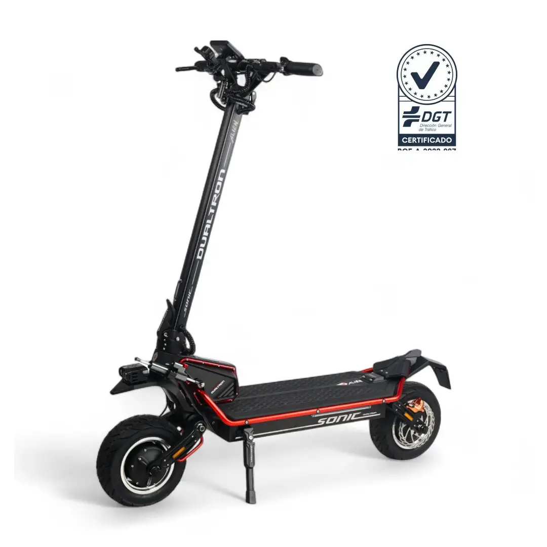Dualtron Sonic Alien. Patinete eléctrico homologado por la DGT con una potencia descomunal gracias a su Motor Dual 2x2500W. Este patinete eléctrico está equipado con una batería 72V 40Ah Samsung. Con esto es capaz de lograr una autonomía de hasta 125 kilómetros con una sola carga. Además de su sistema de frenado con unos frenos NUTT 4 pistones + discos 160mm y su pantalla multifunción TFT Color EYA, donde podrás tener el control de tu patinete eléctrico.