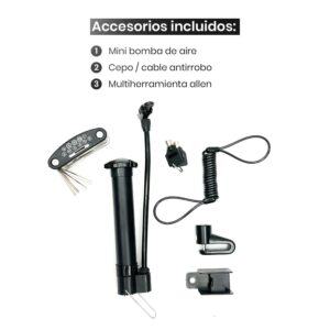 - Luces: Foco frontal de alta luminosidad y luz de freno trasera para que te vean mientras circulas.