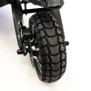- Ruedas neumáticas Tubeless Dual Grip de 10″ resistentes y estables preparadas para circular por todo tipo de terrenos.